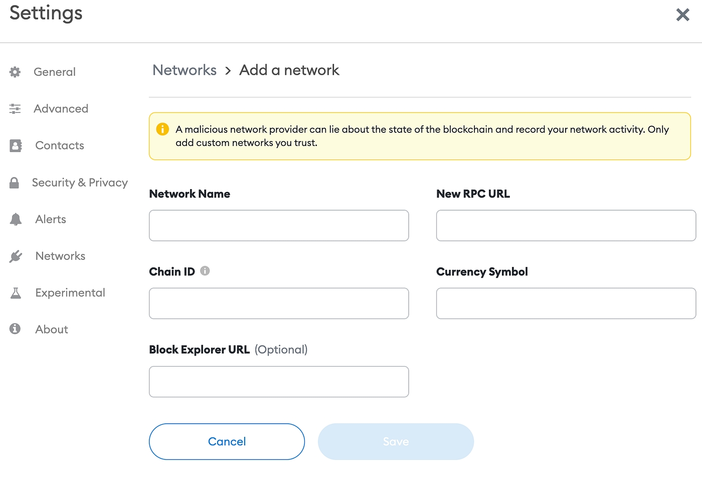 And don’t worry if you get a warning, for example: “This Chain ID is currently used by the ropsten network.”. This is just MetaMask reminding you that you have a different configuration for the same chain, which is fine. Once you’ve filled in these information fields, just click Save!