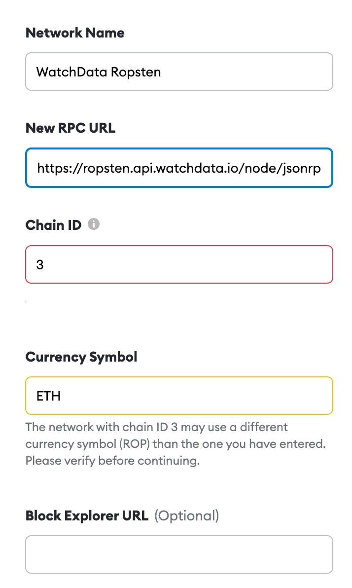 https://ropsten.api.watchdata.io/node/jsonrpc?api_key=YOUR_API_KEY3. Find the chain ID for the network you want to connect to.