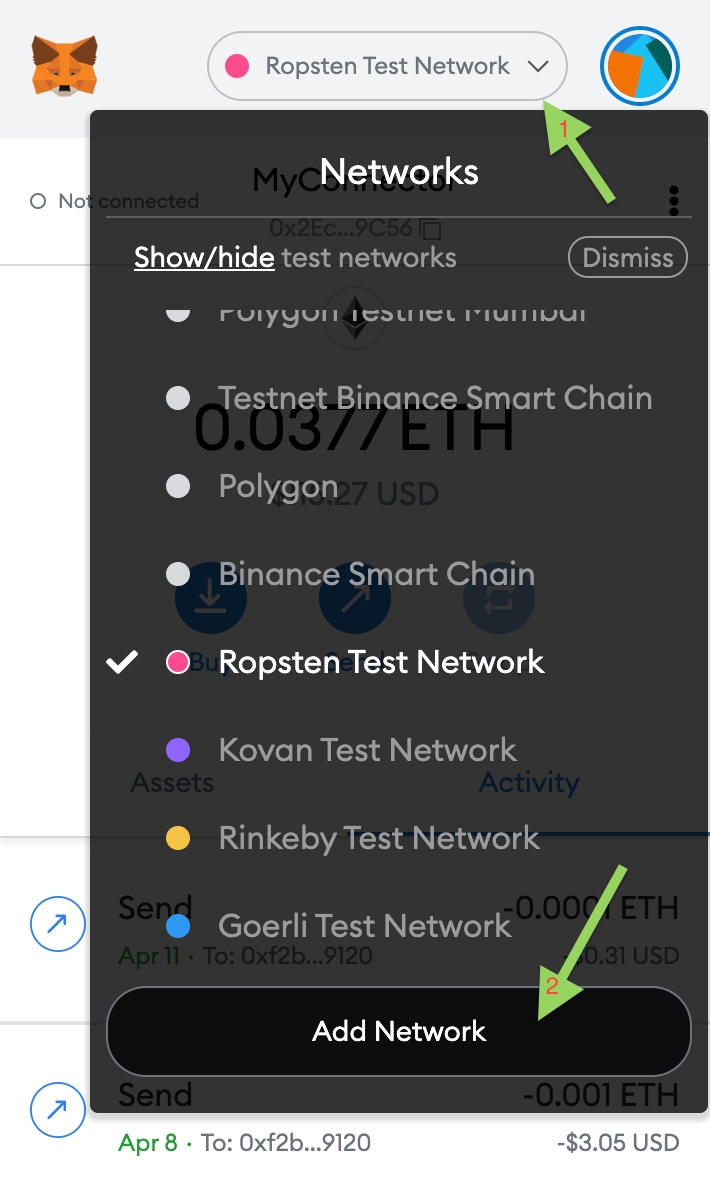Go to your MetaMask wallet and click on the network drop-down list at the top, selecting Custom RPC at the bottom.