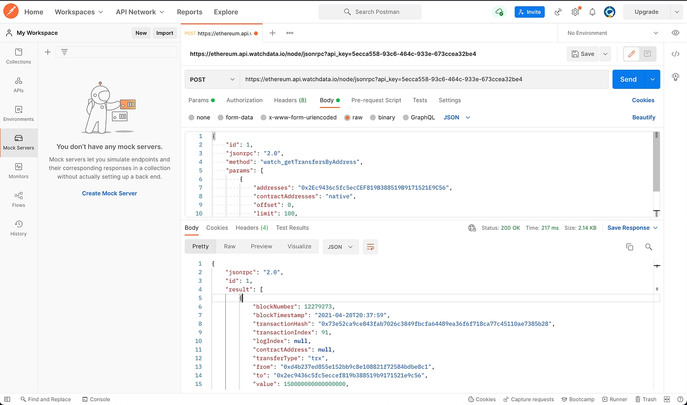 In this example we will not use Vitalikโs wallet address, otherwise we will get a response to the query that takes very many lines. For the example we will take a random address 0x2Ec9436c5fc5ecCEF819B388519B9171521E9C56 with little transaction history. We will use the watch_getTransfersByAddress method to get the transaction history.