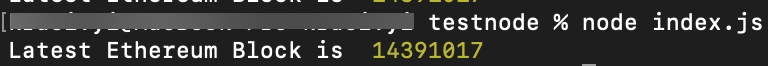 Save this piece of code to an index.js file, which we will run shortly. Run the file with the node command, and you will see the last block number from the Ethereum network: